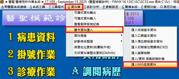 操作說明: 於醫聖主畫面點選系統工具列「D 資料庫>醫令資料匯入>匯入NIIS疫苗資料」