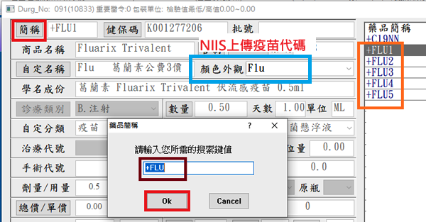 於『4藥品資料』按下『簡稱』輸入『+FLU』再按下『Ok』可搜尋Flu流感疫苗相關品項