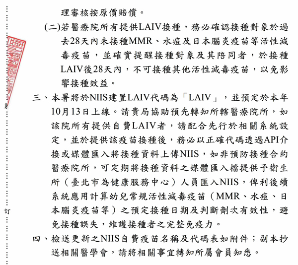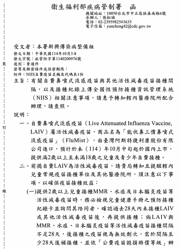 有關自費鼻噴式流感疫苗接種與NIIS相關注意事項