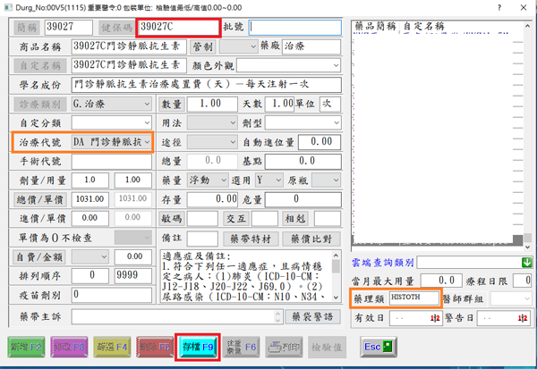 (2) 確認『數量』『天數』為『1』、『治療代號』欄位為『DA』、『藥理類』欄位為『HISTOTH』