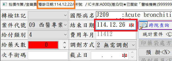 *全部療程結束後,再進入第一天批價作業畫面,如下圖紅框處,輸入『結束日期』即可申報!