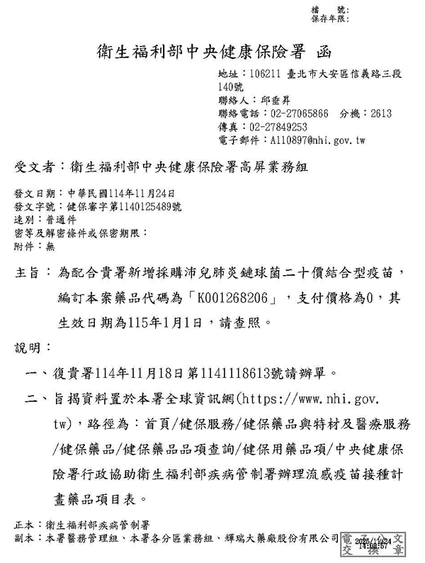 新增沛兒肺炎鏈球菌二十價結合型疫苗藥品代碼為「K001268206」