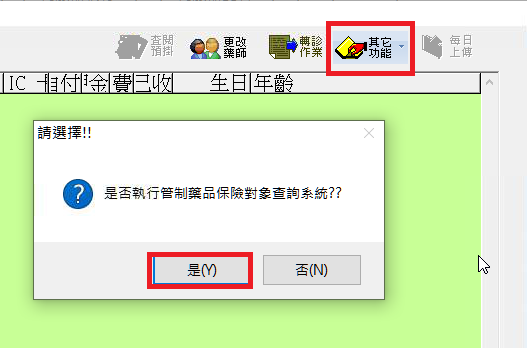 ~使用參數設定:其他功能是否詢問要執行管藥對象查詢系統=Y 時執行開啟~