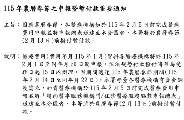 115年農曆春節之醫療費用申報暨暫付款時程通知