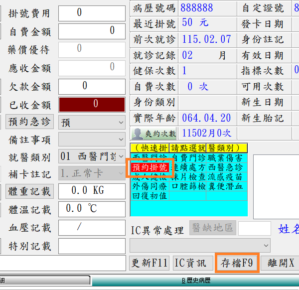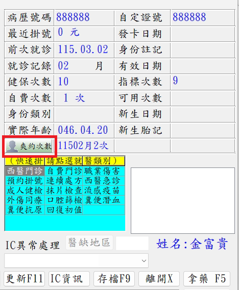 ● 執行新增掛號或掛號修編畫面可查閱『爽約次數』