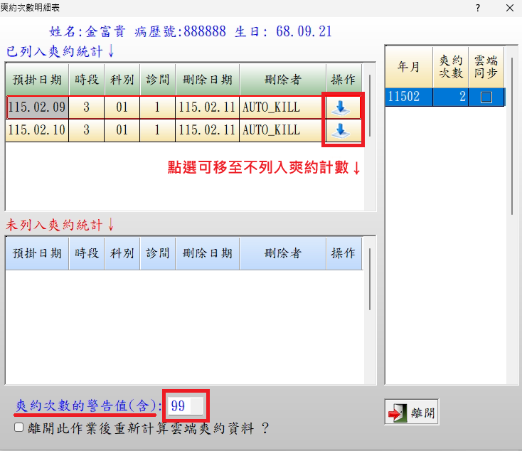 ●『爽約次數的警告值(含)』右方欄可設定需提醒次數(如上圖紅框處)
